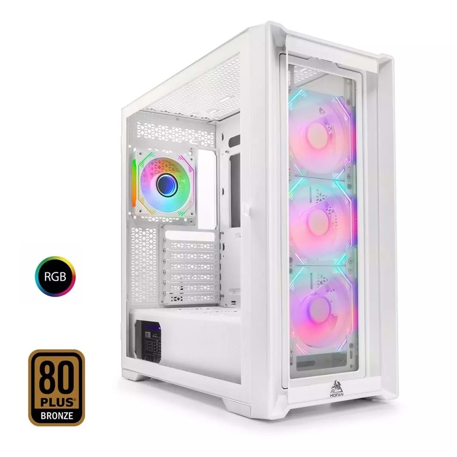 MOFAN MF2902W 360, zarif beyaz rengi, temperli cam ön ve yan panelleriyle hem estetik hem performansı bir arada sunan üst seviye bir oyuncu kasasıdır. E-ATX uyumluluğu, 360mm sıvı soğutma desteği ve geniş iç hacmi sayesinde güçlü sistemler kurmak isteyen kullanıcılar için ideal bir çözümdür.