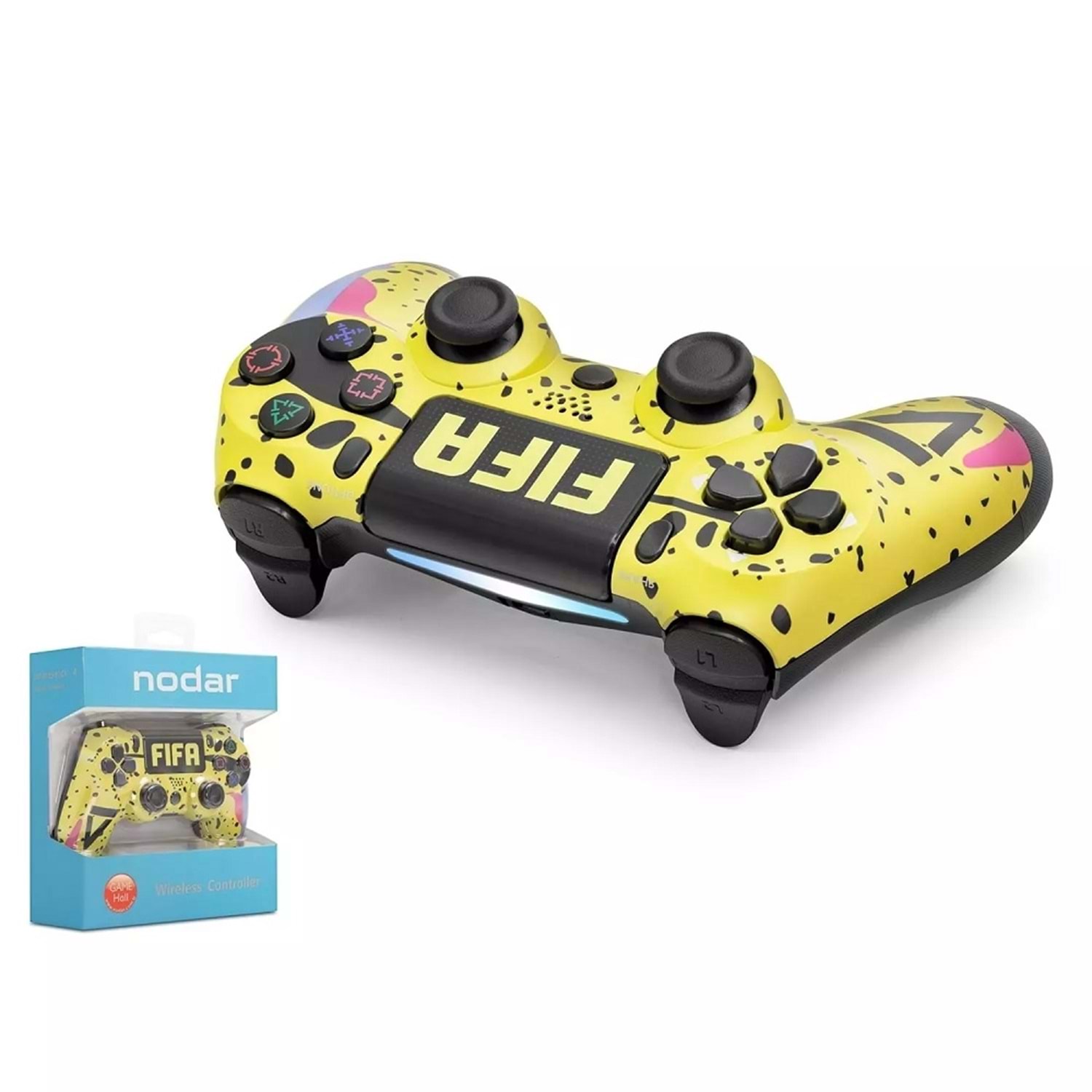 Nodar ND400S, PlayStation 4 platformunda rekabetçi spor oyunları için geliştirilen,canlı sarı (FIFA Edition)temalı özel grafik tasarımını gelişmiş kontrol teknolojileriyle birleştiren profesyonel bir kablosuz oyun koludur. Gövde üzerindeki dinamik siyah desenler, dokunmatik paneldeki ikonik "FIFA" logosu ve ergonomik yapısıyla sahada mutlak hakimiyet kurmanızı sağlar.