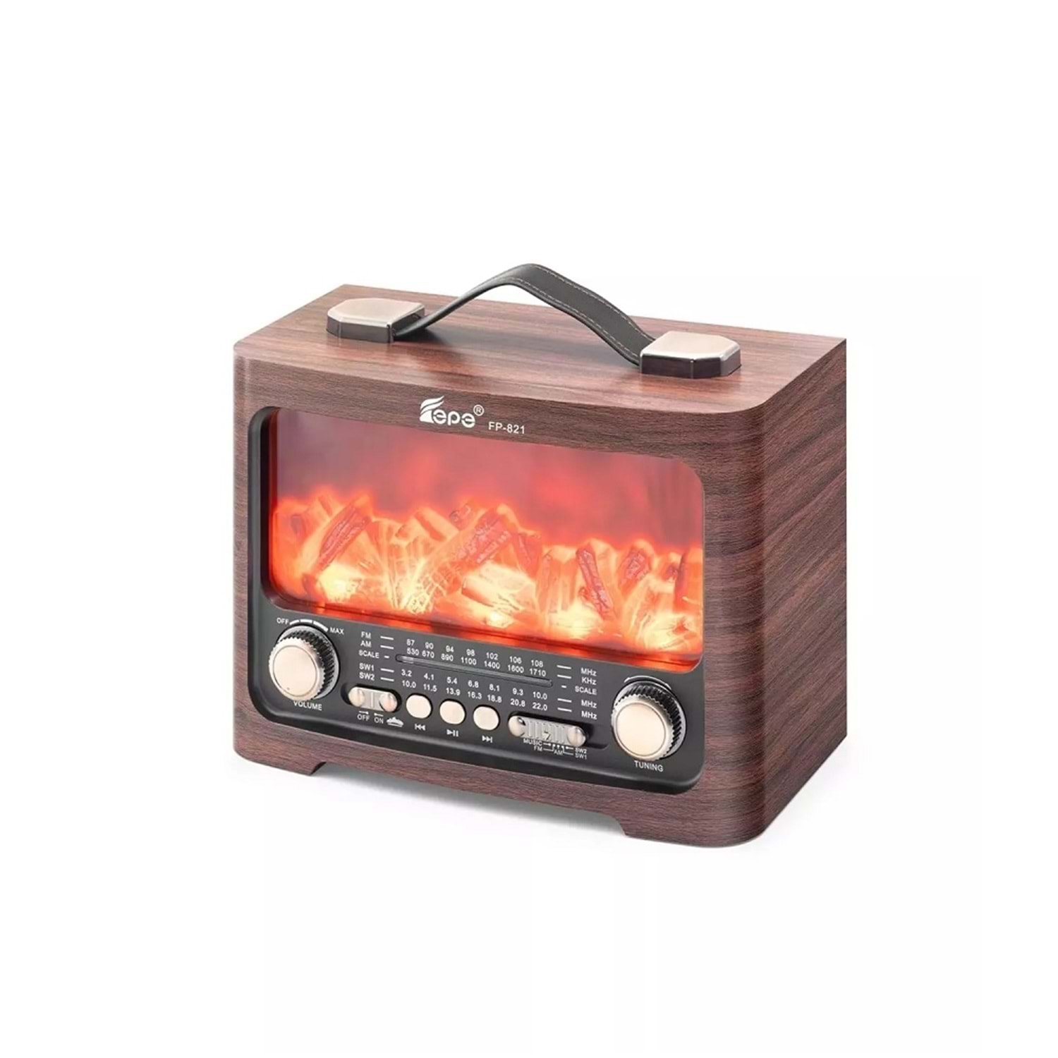FEPE FP821 BLUETOOTH NOSTALJİK FM RADYO USB TF AUX LED ALEV EFEKTLİ TAŞINABİLİR HOPARLÖR - KAHVERENGİ